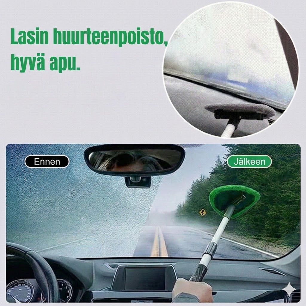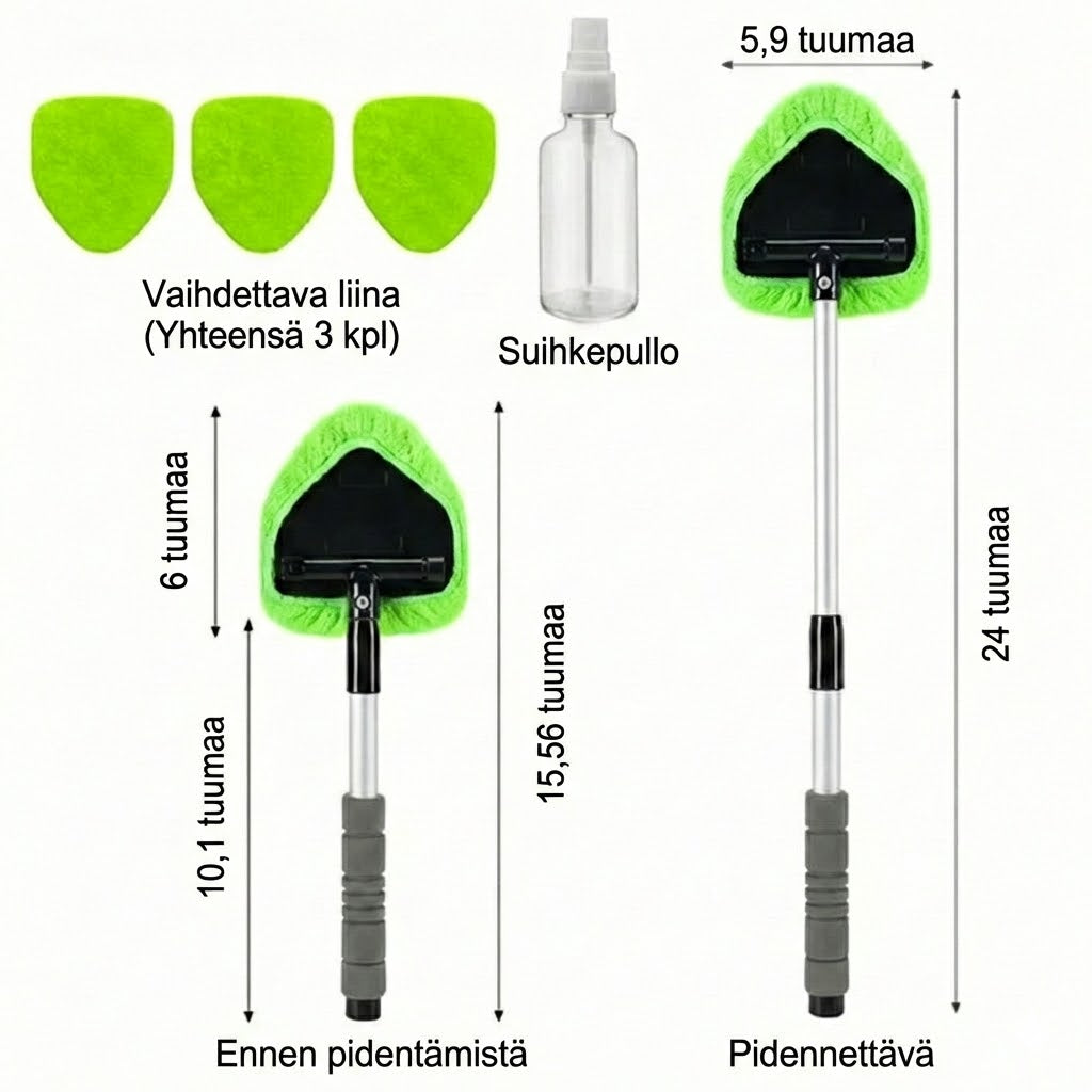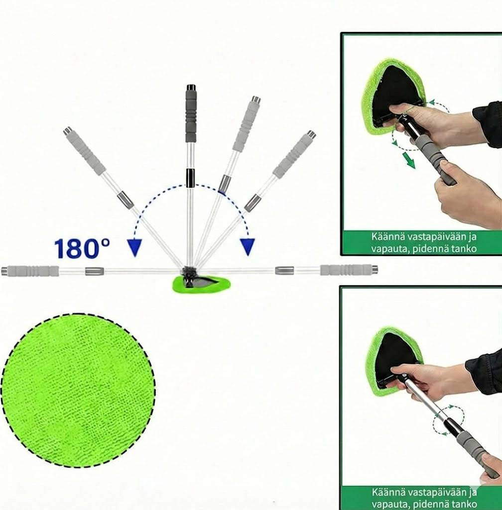 Vaivaton puhdistus:Tekee auton ikkunoiden puhdistamisesta sisältä ja ulkoa lastenleikkiä. Pitkän varren avulla saavutat jokaisen kohdan vaivatta ja saat raidattoman lopputuloksen.
